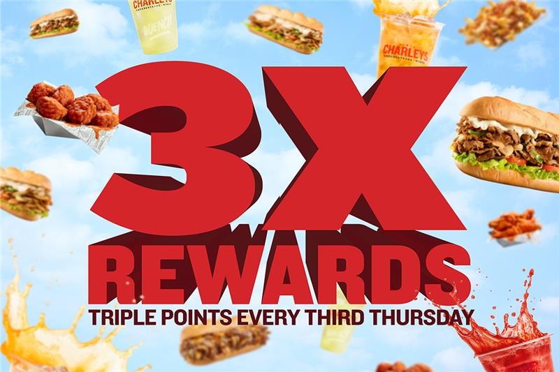 Triple Point Thursdays start October 16th...and continue every third Thursday each month after that! We're giving you 3x Rewards when you order in store or online with your loyalty account at Charleys. Get rewarded when you purchase your…