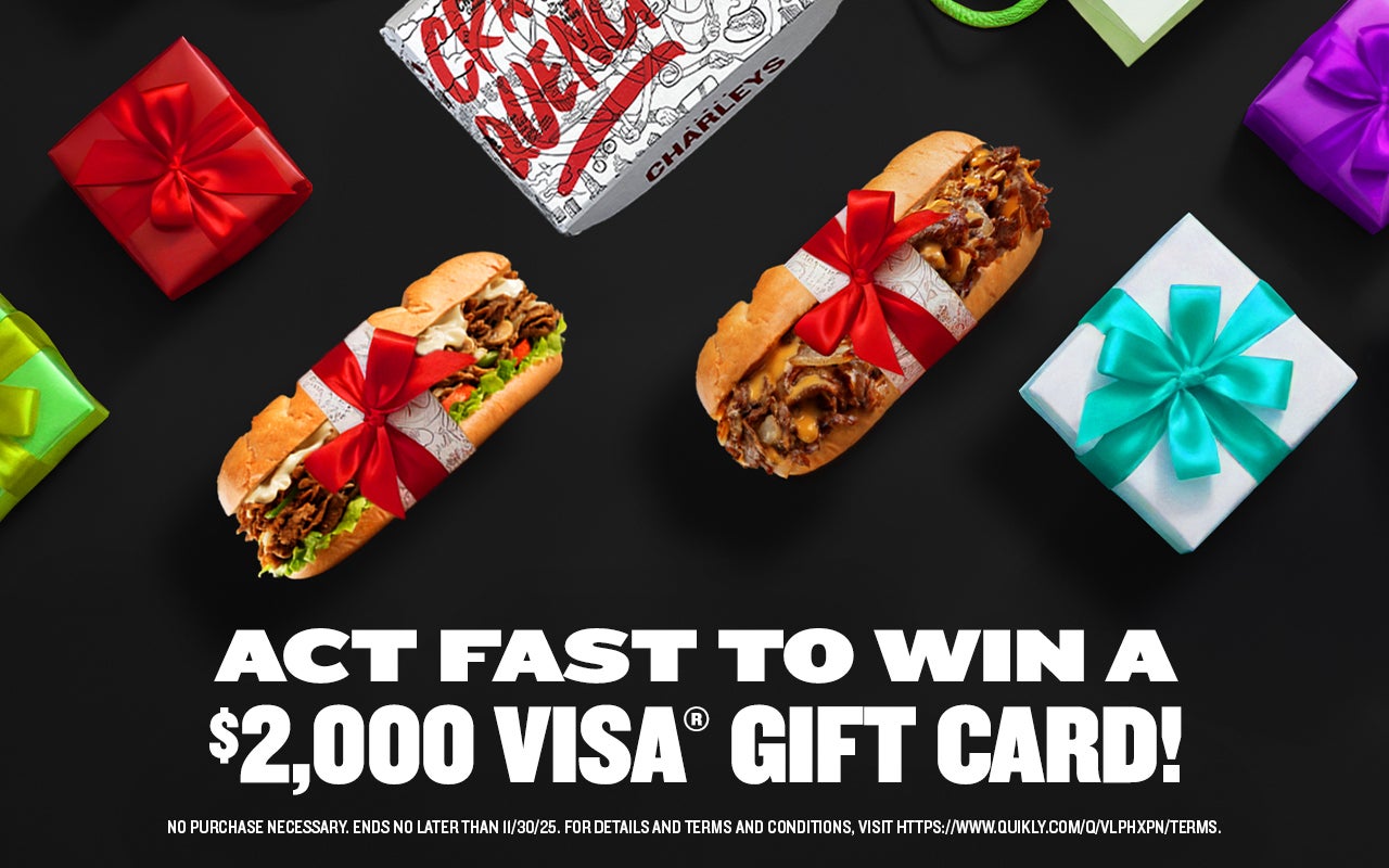 This holiday season, we want to give back to our customers who have given so much to us! A $2,000 Visa® Gift Card and $250 and $100 Charleys e-Gift Cards will be released soon, along with thousands of exclusive offers. Enter now and then get ready to move fast as only the quickest score the best prizes.